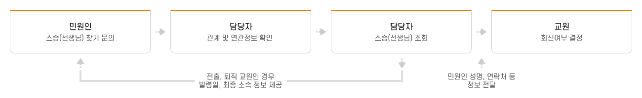 - 담당자 : 스승(선생님) 조회(전출, 퇴직 교원인 경우 발령일, 최종 소속 정보를 민원인에게 제공합니다. 담당자는 교원에게 민원인 성명, 연락처 등 정보를 전달합니다.)