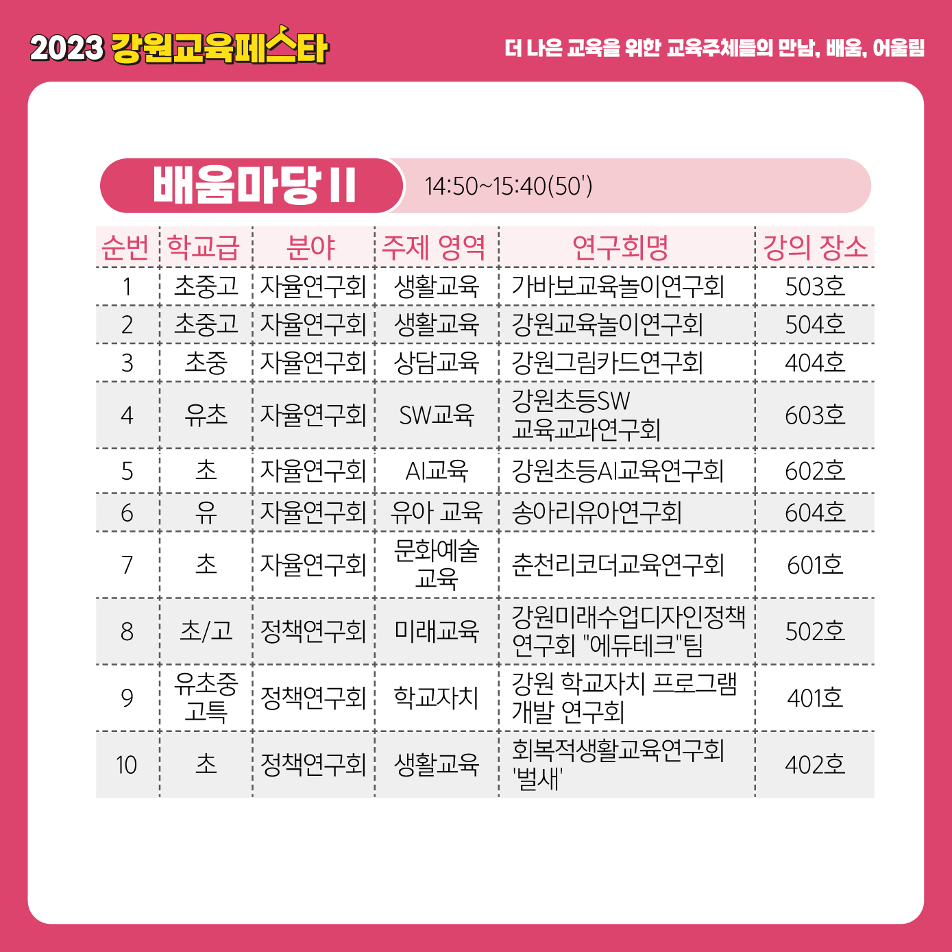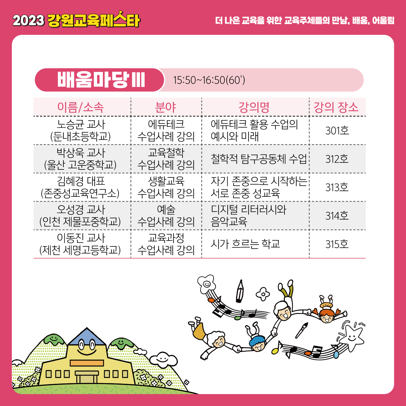 ◦ 배 움 마 당: 교원대상 전문가 강연, 연구회 사례 나눔